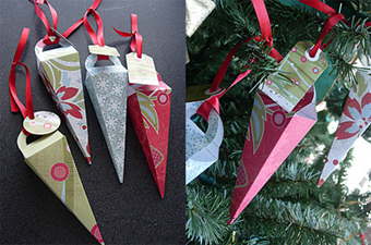 • Napełnij torebkę słodyczami, przewiąż uchwyty razem kolorową wstążeczką i zawieś na choince.