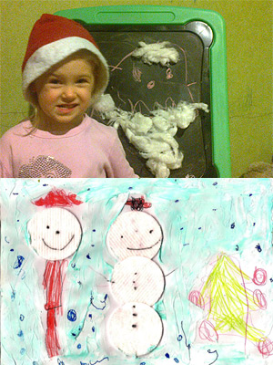 Mama napisała: Małgosia zrobiła 2 prace. Jednego mikołaja namalowała kredą na tablicy i przykleiła mu brodę z waty, a drugiego mikołaja namalowała razem z bałwankiem i choinką. Na drugim obrazku mikołaj ma głowę zrobioną z wacika (na głowi Małgosia namalowała mu garnek, bo powiedziała, że czapki jeszcze nie umie malować) a bałwanek jest cały z wacików. Śnieg Małgosia zrobiła pastą do zębów. Gdy obrazek wysechł namalowała mazakiem śnieżynki.