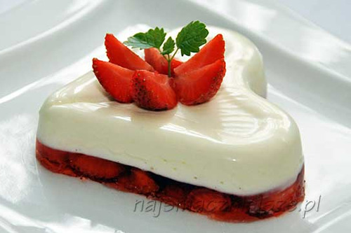 Panna cotta to deser pochodzący z północnych Włoch. Jego podstawą jest podgrzana śmietana wymieszana z żelatyną. W prezentowanej wersji deser został wzbogacony o galaretkę z kawałkami truskawek. Deser jest tak piękny, że "je się go oczami" i baaaaaaaardzo smakuje.